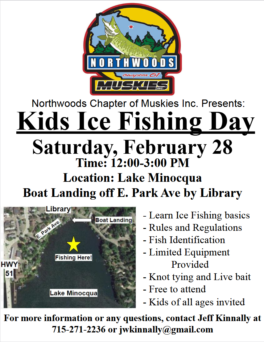 Join Northwoods Muskies Inc. for our annual Kids Fishing Day on Lake Minocqua on Saturday, February 28, 2026.